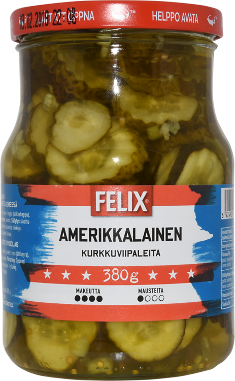 Felix® Amerikkalainen kurkkuviipale on yksi Suomen suosituimmista maustekurkkuviipaleista, eikä ihme. Amerikkalainen kurkkuviipale on juuri sopivan mausteinen ja makea kurkku, täydellinen kaveri esimerkiksi hampurilaiselle tai voileivälle. Kokeile myös wrappien sisään tai voileipägrillissä valmistettavien leipien väliin. Felix Amerikkalainen kurkkuviipale ei sisällä säilöntäaineita ja se sopii vegaanista ruokavaliota noudattavalle. Purkin helppo avata -kansi on käytössä vaivaton ja kätevä. Felix – herkkuja ruokapöytään®.
