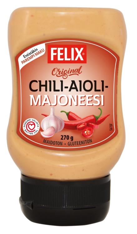 Felix® Chili-Aiolimajoneesi on herkullinen, täyteläinen ja monikäyttöinen majoneesi, joka antaa lisämakua ja sopivasti chilistä potkua suosikkiruokiisi. Se taipuu mainioisti myös dippailuun. Majoneesi on jogurttipohjainen ja siinä yhdistyy sopivassa suhteessa tulinen chili ja valkosipuli. Tämä majoneesi ei jätä ketään kylmäksi. Tuotteelle on myönnetty terveellisemmästä valinnasta kertova Sydänmerkki. Felix – Herkkuja ruokapöytään®.