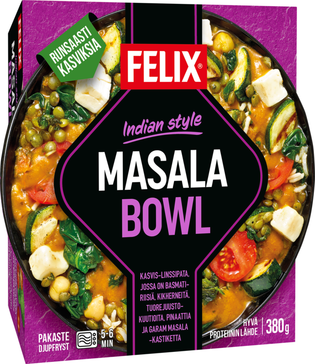 Felix® 1-hengen pakasteateriat on monipuolinen sarja ruokaisia valmisaterioita, joissa on runsaasti hyvää makua. Pakasteaterioiden etuna on pitkä säilvyys ja raaka-aineiden säilyminen tuoreena annoksen nauttimiseen asti. Hieman eksoottisemman makuelämyksen tarjoaa Felix Indian Masala Bowl, joka on herkullista, intialaiseen tapaan garam masalalla maustettua kasvis-linssipataa, ja sisältää runsaasti värikkäitä kasviksia. Ateria sopii hyvin kasvisruokavaliota noudattavalle lounaaksi, illalliseksi tai hätävaraksi kodin pakkaseen. Hyvää ruokahalua intialaisittain! Felix – herkkuja ruokapöytään®.