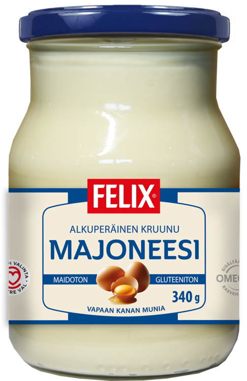 Felix® Kruunumajoneesi tuo mehevyyttä ja makua ruokiisi. Tämä täyteläinen ja herkullinen majoneesi sopii sellaisenaan nautittavaksi tai raaka-aineeksi erilaisiin täytteisiin ja kastikkeisiin. Kokeile esimerkiksi perinteisen levitteen sijaan voileivän päälle, tai valmista oma makumajoneesi maustamalla Felix Kruunumajoneesi yrteillä tai muilla mieleisilläsi mausteilla. Hae kiinnostavat reseptit osoitteesta felix.fi. Felix Kruunumajoneesille on myönnetty terveellisemmästä vaihtoehdosta kertova Sydämerkki. Felix – Herkkuja ruokapöytään®.