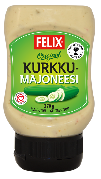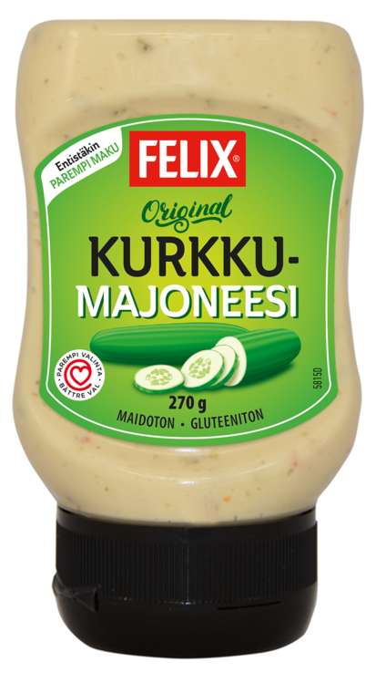Felix® Kurkkumajoneesi on raikkaan ja herkullisen makuinen, täyteläinen majoneesi. Pienet ja rapsakat kurkun palat antavat majoneesille aidon maun lisäksi sopivan ruokaisan rakenteen. Kurkkumajoneesi on yksi suosituimmista majoneesimauista, jota kannattaa kokeilla voileipien väliin, ruuan oheen kylmäksi kastikkeeksi tai vaikka dippailuun. Tuotteelle on myönnetty terveellisemmästä valinnasta kertova Sydänmerkki. Felix – Herkkuja ruokapöytään®.