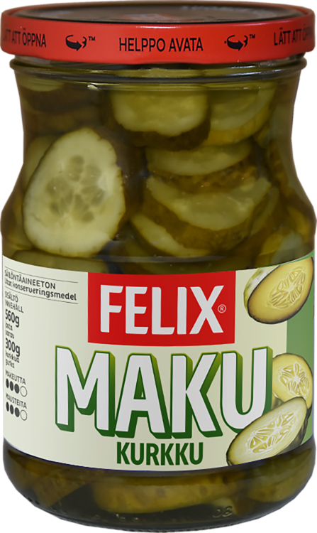 Felix® Maku-kurkku on Suomen suosituin viipalekurkku, josta ei nimensä mukaisesti makua puutu. Maku-kurkkua on valmistettu jo vuodesta 1969 alkaen. Tämä herkullinen maustekurkku antaa lisämakua leivän päälle tai hampurilaisen väliin, sopii lisukkeeksi moneen ruokaan ja on mainio myös annosten koristeluun. Maku-kurkku maistuu varmasti koko perheelle. Tuote on lisäaineeton ja purkin kansi aukeaa helposti. Felix Maku-kurkku sopii vegaanista ruokavaliota noudattavalle. Felix – herkkuja ruokapöytään®.