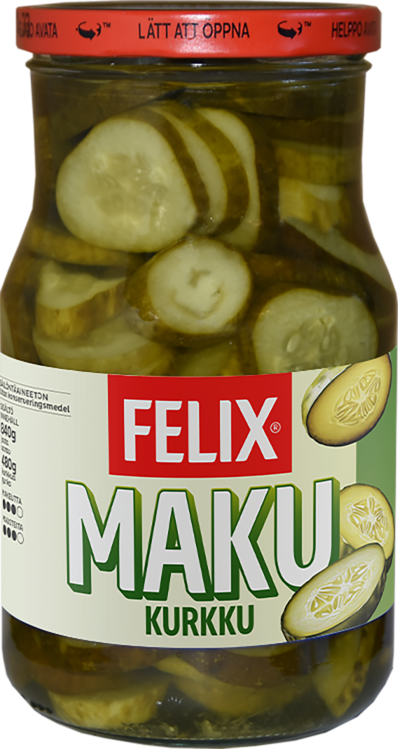 Felix® Maku-kurkku on Suomen suosituin viipalekurkku, josta ei nimensä mukaisesti makua puutu. Maku-kurkkua on valmistettu jo vuodesta 1969 alkaen. Tämä herkullinen maustekurkku antaa lisämakua leivän päälle tai hampurilaisen väliin, sopii lisukkeeksi moneen ruokaan ja on mainio myös annosten koristeluun. Maku-kurkku maistuu varmasti koko perheelle. Tuote on lisäaineeton ja purkin kansi aukeaa helposti. Felix Maku-kurkku sopii vegaanista ruokavaliota noudattavalle. Felix – herkkuja ruokapöytään®.