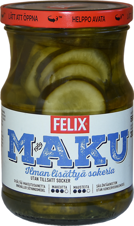 Felix® Maku-kurkku ilman lisättyä sokeria on herkullisen makuinen ja monipuolinen maustekurkku, ja sopii erityisesti niille kuluttajille, jotka haluavat välttää sokeria ruokavaliossaan. Kokeile leivän päälle, patongin väliin tai herkuttele sellaisenaan. Tuote on säilöntäaineeton ja sopii vegaanista ruokavaliota noudattavalle. Maku-kurkkupurkin kansi aukeaa helposti, sillä siinä on helppo avata -kansi. Felix – herkkuja ruokapöytään®.