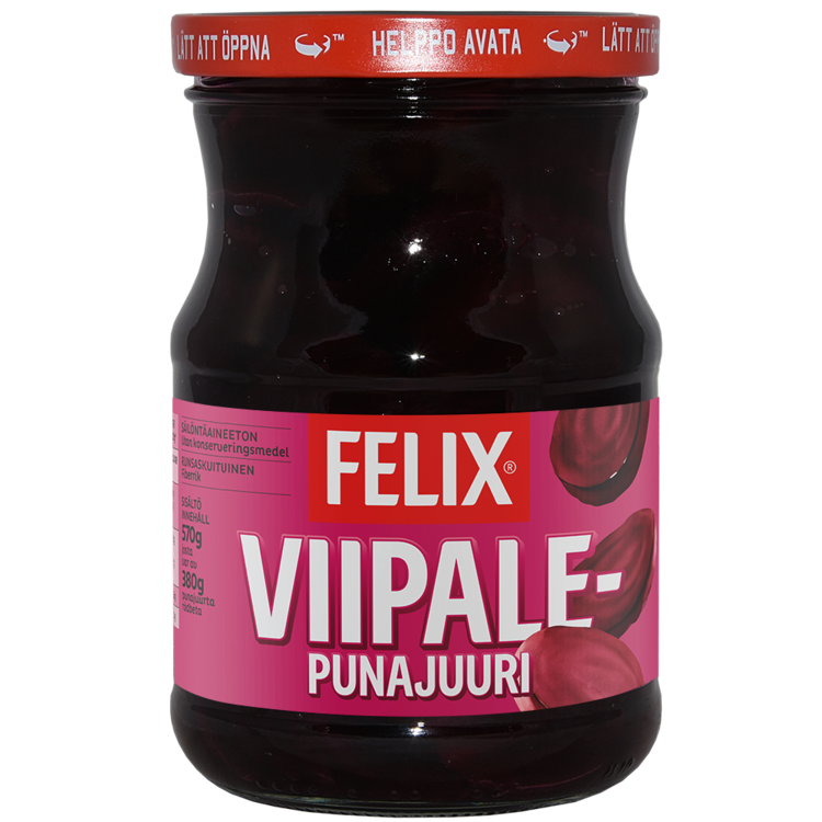 Felix® Viipalepunajuuriviipaleet on paitsi hyvän makuisia, myös käteviä käyttää suoraan purkista, ilman pilkkomista. Kokeile esimerkiksi kasvispyttipannun kaverina tai sellaisenaan leivän päällä. Vinkki: punajuuren liemi kannattaa hyötykäyttää hävikin vähentämiseksi. Punajuuren liemellä voit esimerkiksi värjätä pastan kauniin vaaleanpunaiseksi, tai maustaa kermaviilin dippaamista varten. Felix Viipalepunajuuret ovat myös terveellinen vaihtoehto, sillä ne ovat runsaskuituisia ja tuotteelle on myönnetty Sydänmerkki. Tuote on säilöntäaineeton ja se sopii vegaanista ruokavaliota noudattavalle. Lisäksi purkissa on helppo avata -kansi, joka lisää käyttömukavuutta. Felix – herkkuja ruokapöytään®.